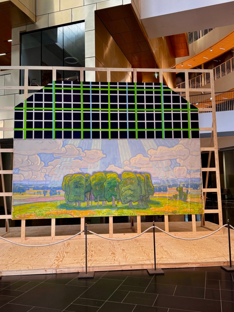 Prins Eugens del av skiss till altartavlan i Kiruna med den solljusstrålande träddungen. Tavlan saknar religösa symboler, naturen får stå för andligheten.